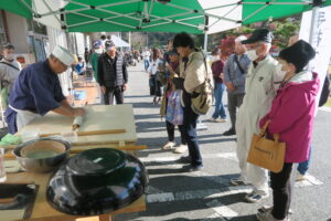 そば販売開始の午前10時30分には長い行列ができていました。地元のそば打ち名人5人が手打ちをした「けんちんそば」150食、「かけそば」50食は、正午過ぎにはすべて完売となりました。食べられなかった方には、申し訳ありませんでした。